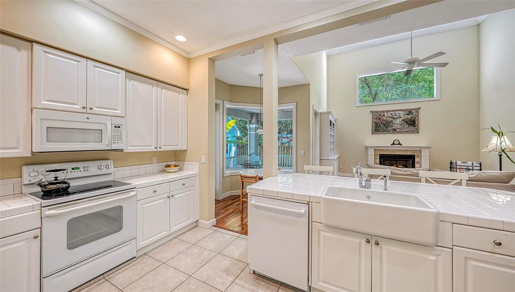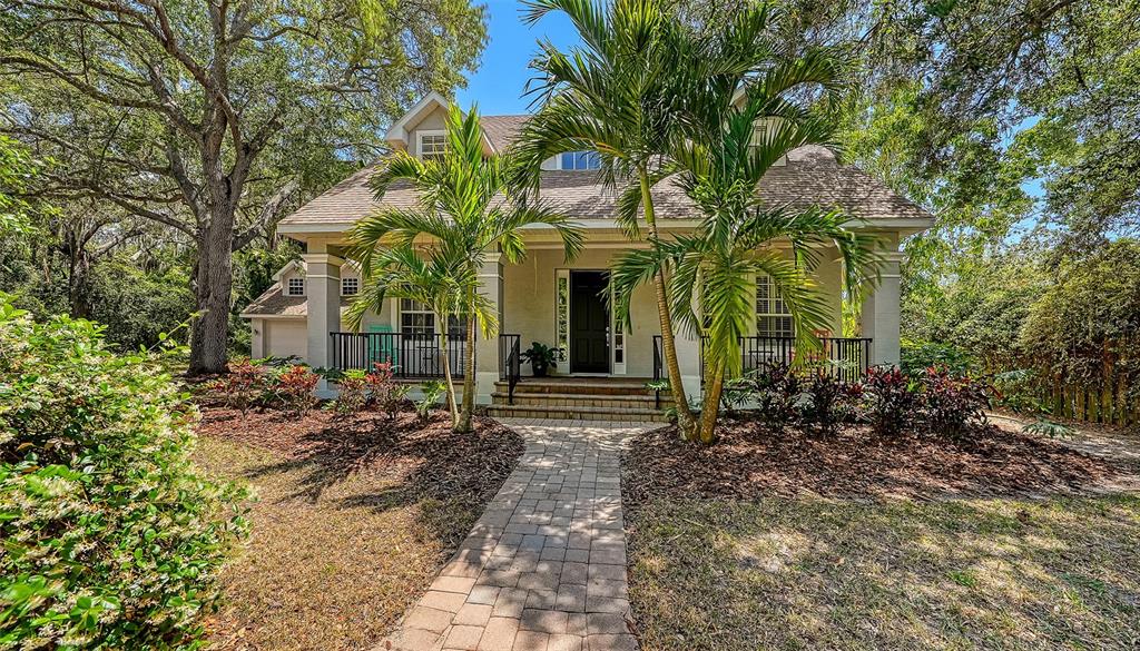 Charm, grandeur, spaciousness, and privacy fuse together throughout this 2004 custom two-story Key West- style Cape home. A peaceful Florida setting, and beautiful interiors evoke a sense of laidback elegance, nestled amidst tree canopies on a quiet dead-end street in Sapphire Shore/Indian Beach. The covered front porch spanning the front of the home, Adirondack rocking chairs invite you to take a seat and enjoy the sounds of nature before retreating inside. Soaring volume 18-foot ceilings capped in crown molding, Brazilian Oak wood floorings, broad windows, built-ins, and a gas fireplace accentuate the living room that shares space with the eat-in kitchen and opens to the back screened patio. A stolid wood staircase with wood insert border draws your attention to the second floor. The chef will relish preparing meals, gathering with family, and hosting events in the generous open concept that grants an indoor-outdoor lifestyle. Radiant cabinetry and a peninsula with seating in the kitchen are juxtaposed to the formal dining room and adjacent nook with aquarium window that connects to the patio. Efficiency and solitude are optimized in the floorplan, situating the master suite with en-suite bath on the first floor and the second floor features the mezzanine, two guest bedrooms and a guest bath. All bedrooms are beautified with beadboard ceilings, and the mezzanine has a railing for overlooking the great room below. Additional items of note are the bathrooms including wainscotting and Toto fixtures, and there are two HVAC systems. The large outdoor lounging area offers sanctuary just off the screened porch with a paver patio area and access to the detached two-car garage that allows the possibility of a second-story office or flex room. Simple yet upscale, this stunning home fulfills your lifestyle wishes with proximity to Ringling College, Ringling Museum of Art, theaters, colleges, and attractions as well as within a short walking distance of Charles Hegener Memorial Nature Walk with access to Sarasota Bay that offers a canoe/kayak launch, and views of Downtown Sarasota, Longboat Key, and sunsets. Conveniently located minutes to downtown Sarasota, St. Armands Circle, SRQ Airport, UTC Mall and beaches.